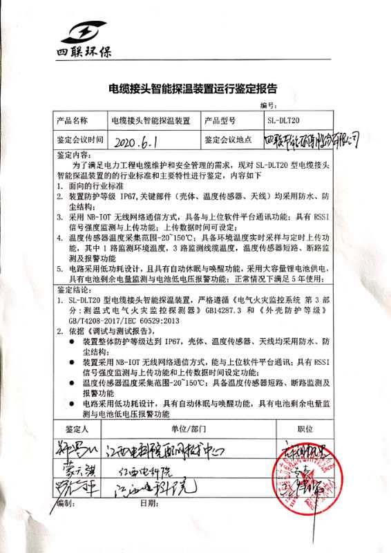 2020年6月1日,我公司与国网•江西省电力科学研究院举行“电缆接头智能探温装置”的运行鉴定会,并邀请了国网江西省电力公司南昌红谷滩分公司的专家。该产品顺利通过鉴定,并得到专家的一致好评。